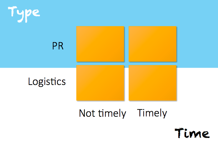The newsletter research culminated in the model shown below. In the diagram you’ll be able to find a home for every piece of content you’ve ever created. Your writing is either logistics or PR based and you write in only two timeframes. I've labeled this as 'Timely' and the creatively labeled 'Not Timely'. Hopefully this will help you realise what you’re writing for.